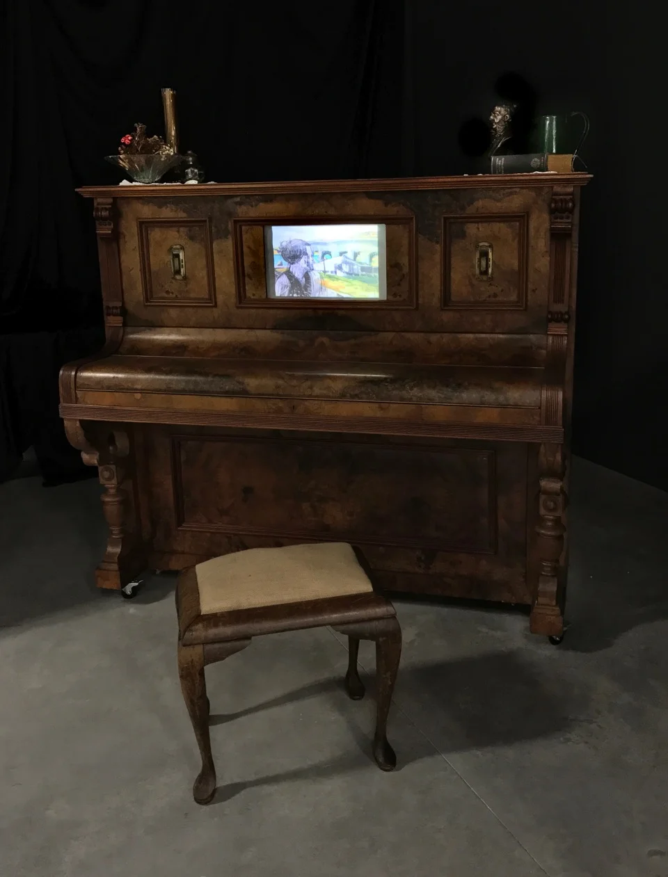 Ode to Clarence creates an intimate domestic setting to watch an animation of the same name. The animation, Ode to Clarence is a hand drawn and painted film created during a residency at Grafton Regional Art Gallery. Grafton is currently undergoing a significant change due to the construction of a new bridge connecting the north and south of the town. This new construction has been in development for nearly thirty years and aims to replace an existing bridge which is no longer suitable for the towns needs. However the existing bridge is of significant heritage status and charm being one of two of its kind in the world. There is a bittersweetness to this towns progress as it watches a new concrete pilot structure grow alongside the beautiful iron bridge that it has both loved and loathed for many years. In this animation, a man arrives in town carrying a tiny piano, falling in love with the bridge, he plays his piano on the banks of the Clarence river while the new bridge is constructed. Like Nero fiddling while Rome burnt to the ground, Ode to Clarence explores changing rural identities and our relationships to them.
